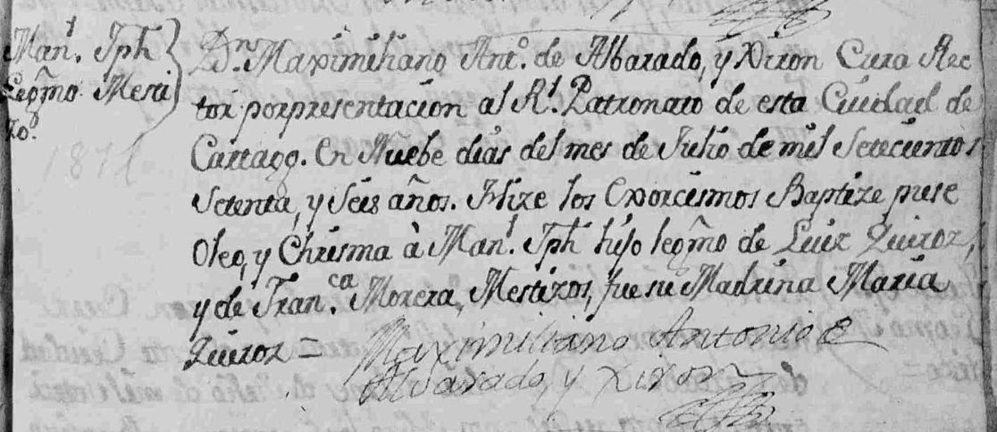 Indica la partida de bautizo que los padres eran mestizos. La madrina fue María Quirós, muy posible su abuela.